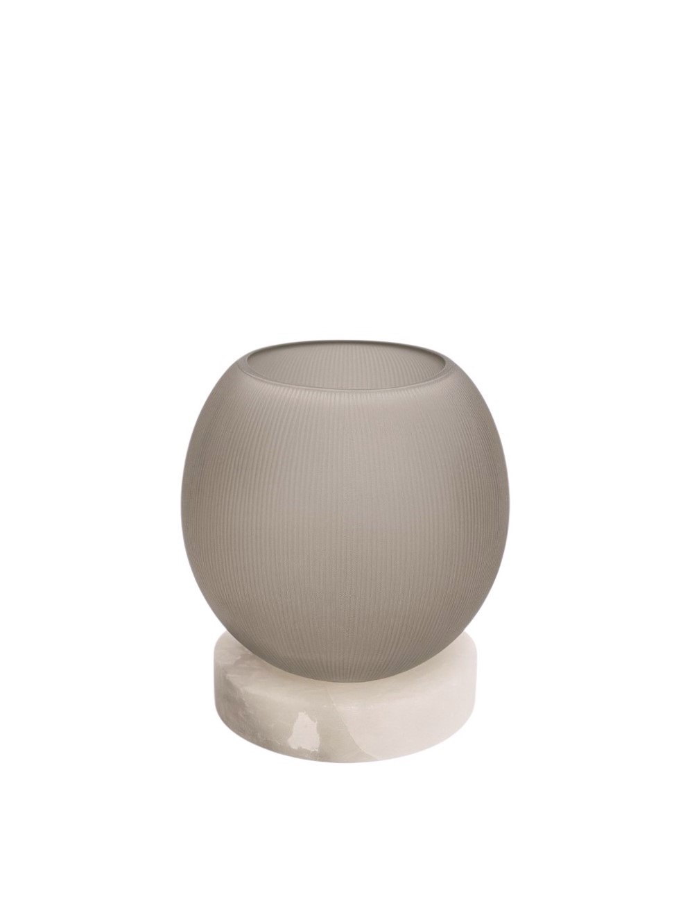 Het windlicht Kasian is vervaardigd uit mondgeblazen glas, wat vervolgens met de hand wordt bewerkt om de textuur aan te brengen. Het windlicht is geplaatst op een voet van mat alabaster. De smoked grijzige kleur van het glas matcht prachtig met de kleur texturen in het alabaster.